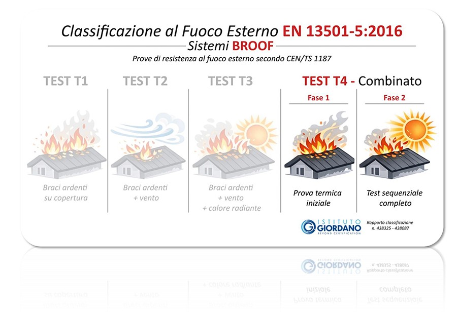 Le nuove indicazioni spostano, infatti, il focus dal solo modulo fotovoltaico all’interazione tra modulo e copertura, richiedendo soluzioni in grado di garantire che il tetto non contribuisca alla propagazione di un incendio esterno. In questo quadro, la classificazione BROOF (T3-T4) secondo la UNI EN 13501-5 è diventata un riferimento decisivo per progettisti, installatori, imprese e committenti chiamati a gestire impianti sempre più diffusi su edifici industriali, commerciali e logistici.