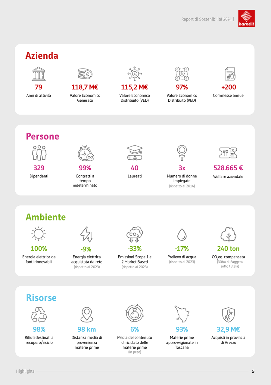 Il documento rinnova l’impegno dell’azienda verso un modello di sviluppo fondato su responsabilità, trasparenza e miglioramento continuo nei tre ambiti ESG - Environmental, Social e Governance. Dopo il successo del primo Report pubblicato lo scorso anno, Baraclit consolida e amplia le proprie azioni in materia ambientale, sociale e di governance, raggiungendo risultati che rafforzano la sua reputazione di impresa sostenibile e innovativa.