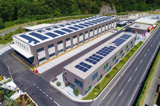 Grande attenzione è stata riservata alla qualità e all’estetica nei materiali di rivestimento di tutto il centro (utilizzato anche il legno nella facciata meridionale) e alla sostenibilità dell’ambiente con postazioni di ricarica auto elettriche e collegamento alla pista ciclabile. La struttura prefabbricata Baraclit ha dimensioni 90x22 metri con un’altezza di 9 metri. Nelle pareti esterne sono stati montati pannelli di tamponamento dello spessore di 25/30 centimetri coibentati a taglio termico con finitura a matrice che richiama il disegno della pietra spaccata. Baraclit ha impiegato in copertura tegoli alari del sistema Aliant Spazio su cui la divisione aziendale per le energie rinnovabili b.POWER ha integrato un impianto fotovoltaico con potenza 132 kWp della superficie di 785 mq.