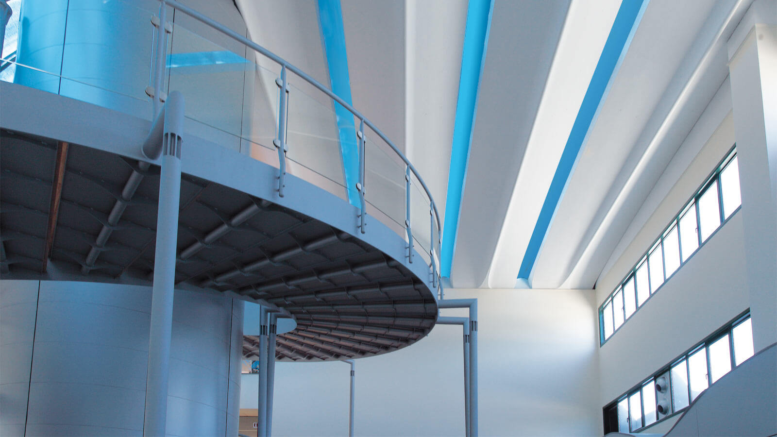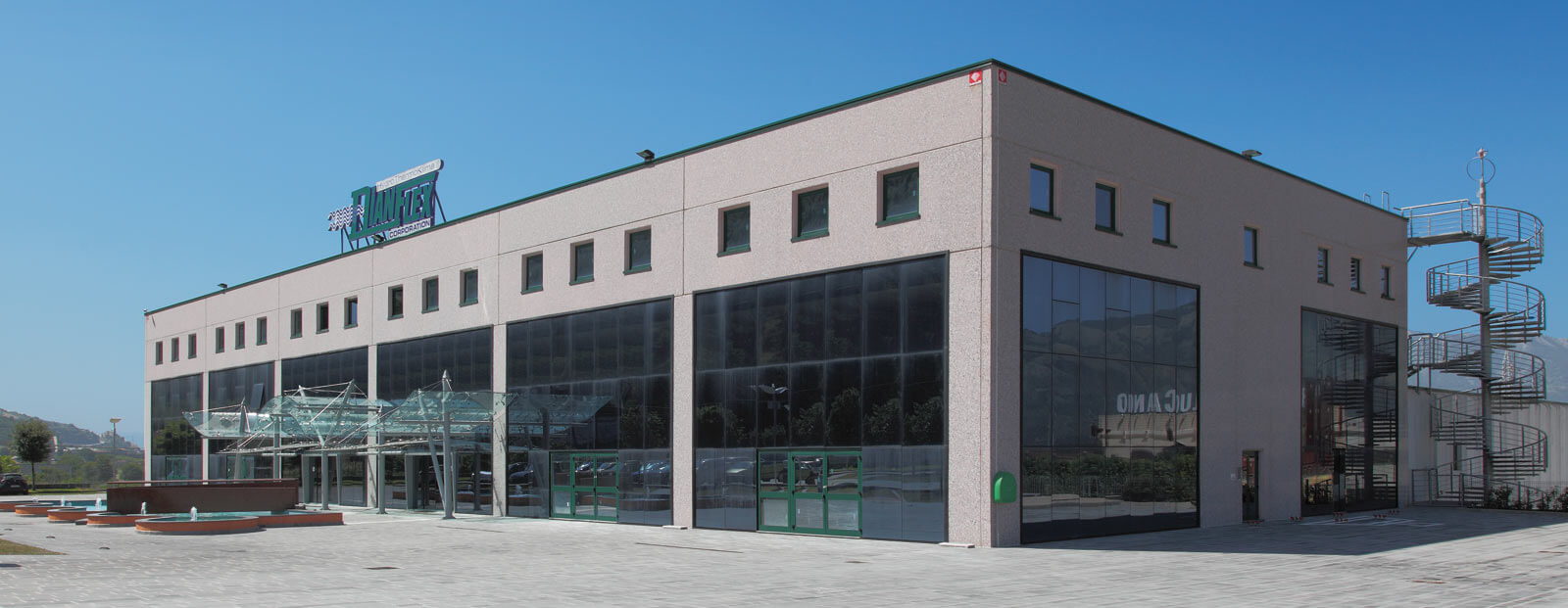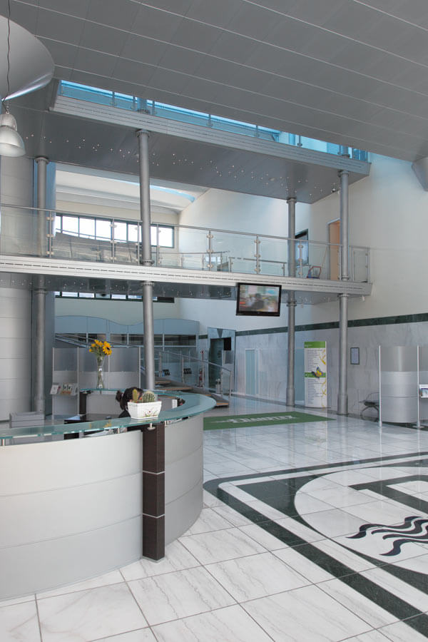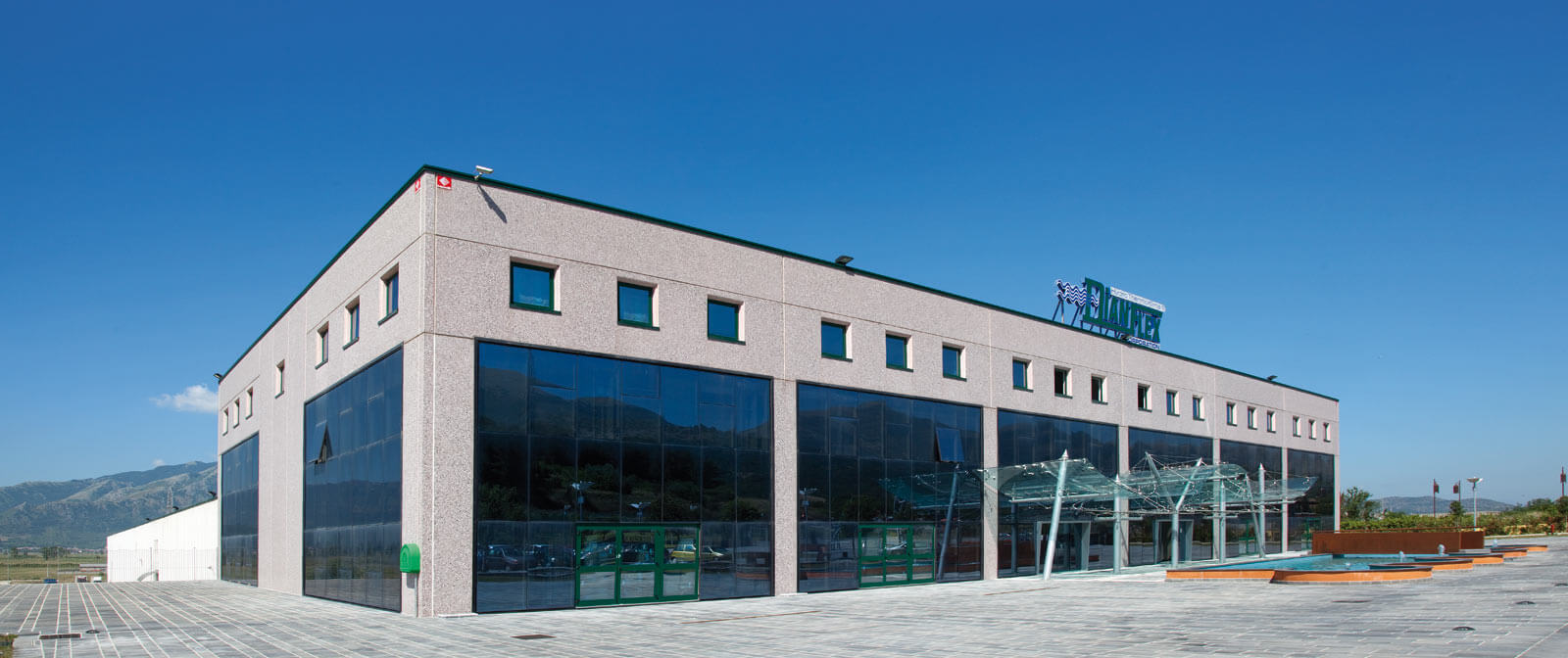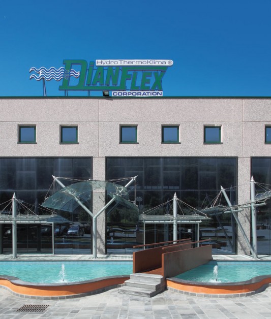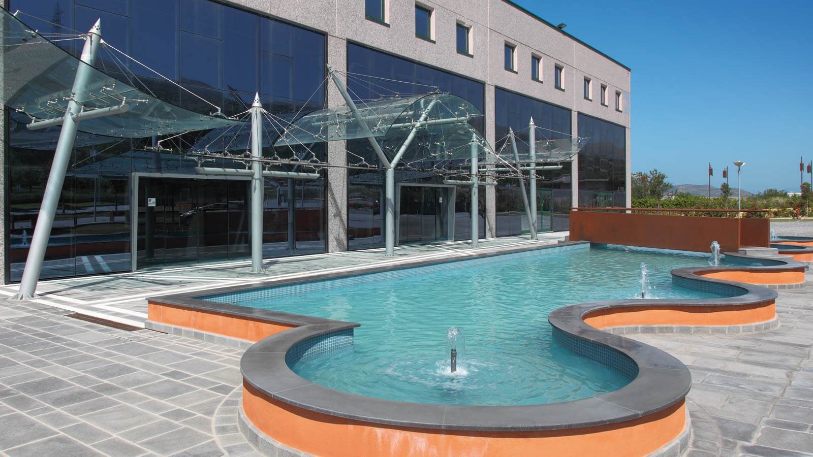 Fontane, vele, onde. Per un’azienda che produce idrotermosanitari l’elemento primario è l’acqua. Uno sviluppo sinergico tra funzione e forma, un ordine razionale di linee essenziali, ampie superfici vetrate e colori chiari sia all’esterno che all’interno con lucernari tinteggiati di azzurro. Ovunque un’idea di freschezza.