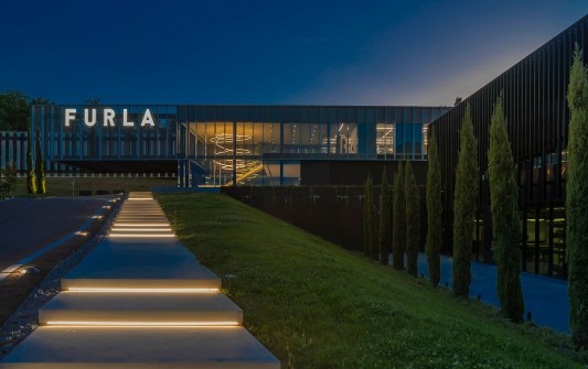 Il complesso Furla è articolato su tre corpi di fabbrica adibiti agli uffici, ai laboratori e alla logistica, in una successione di volumi attentamente studiata per integrarsi in modo armonioso nel sito collinare prescelto. L’ingresso principale rispecchia l’archetipo degli accessi alle ville toscane con un lungo filare di cipressi. Il ritmo ordinato della vegetazione viene riproposto in toni di bianco e nero sulla facciata degli edifici grazie all’impiego, pulito e lineare, di frangisole che mediano la luce all’interno. La natura è presente senza soluzione di continuità. Ampie superfici vetrate, patii e tetti verdi si affacciano ovunque sull’area boschiva, arricchendo il layout e donando comfort agli ambienti.