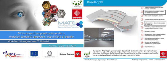 In veste di azienda dalla forte spinta tecnologica, impegnata costantemente in attività di ricerca e sviluppo, Baraclit ha partecipato fra i relatori al workshop inaugurale - tenutosi a Firenze il 13 gennaio 2017 - del Distretto Tecnologico Regionale per i Nuovi Materiali (MATE), che svolgerà un ruolo di trasferimento tecnologico tra mondo delle imprese e ambito scientifico dei centri di ricerca. In occasione del convegno, sono stati illustrati i risultati del progetto di R&S condotto in collaborazione con il Consorzio Polo Tecnologico Magona (CPTM), finalizzato all’impiego della fibra di basalto in campo edilizio per attribuire proprietà antincendio agli elementi del sistema Aliant Spazio/Shed.