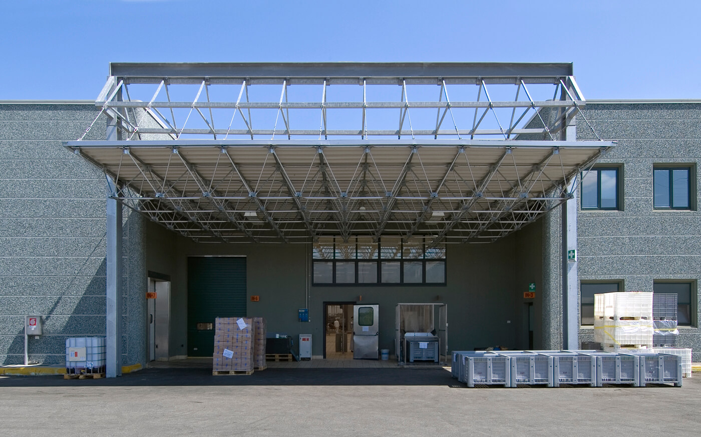 Il vasto complesso (7.000 mq per la produzione, 9.000 adibiti a magazzino e 7.000 per servizi e laboratori di ricerca) si compone di due distinti corpi: la palazzina uffici, le cui forme ricordano volutamente una cascina agricola della pianura parmense, e lo stabilimento che si estende per oltre 100 metri sul fronte autostradale della A1. L’edificio industriale è coperto con i prodotti del ‘sistema Aliant’: Aliant tradizionale nei locali produttivi (per garantire la massima luminosità e vivibilità dell’ambiente), Aliant Spazio nel magazzino (per una razionale distribuzione delle superfici disponibili) e Pianaliant negli uffici (un soffitto piano per una facile suddivisione degli spazi).