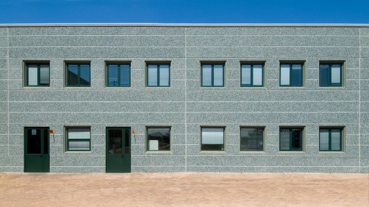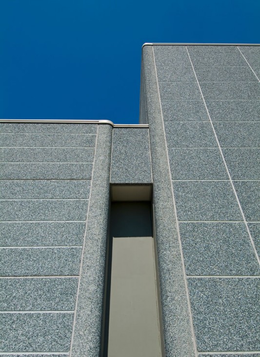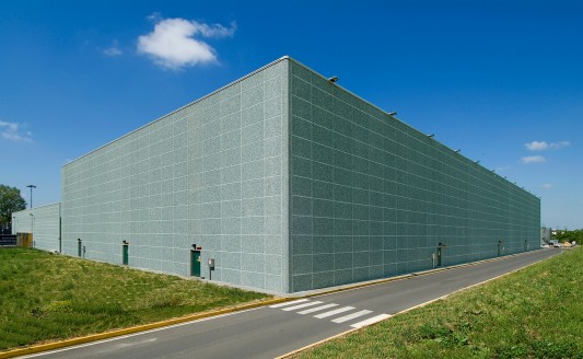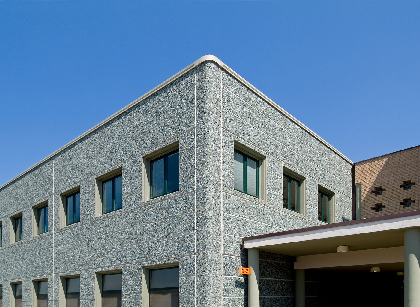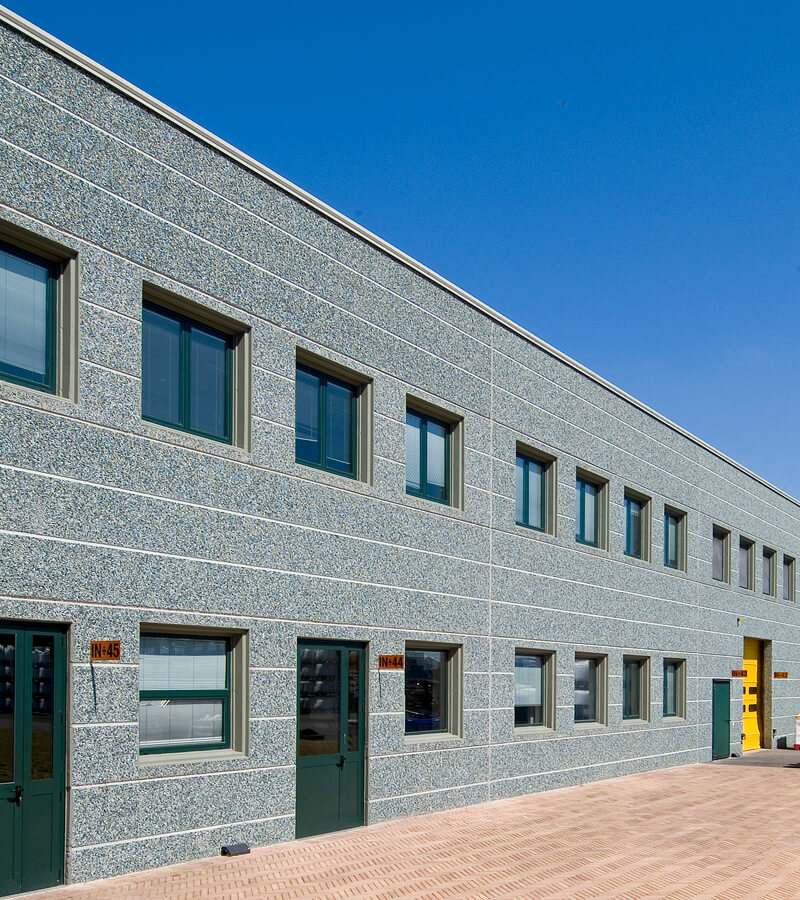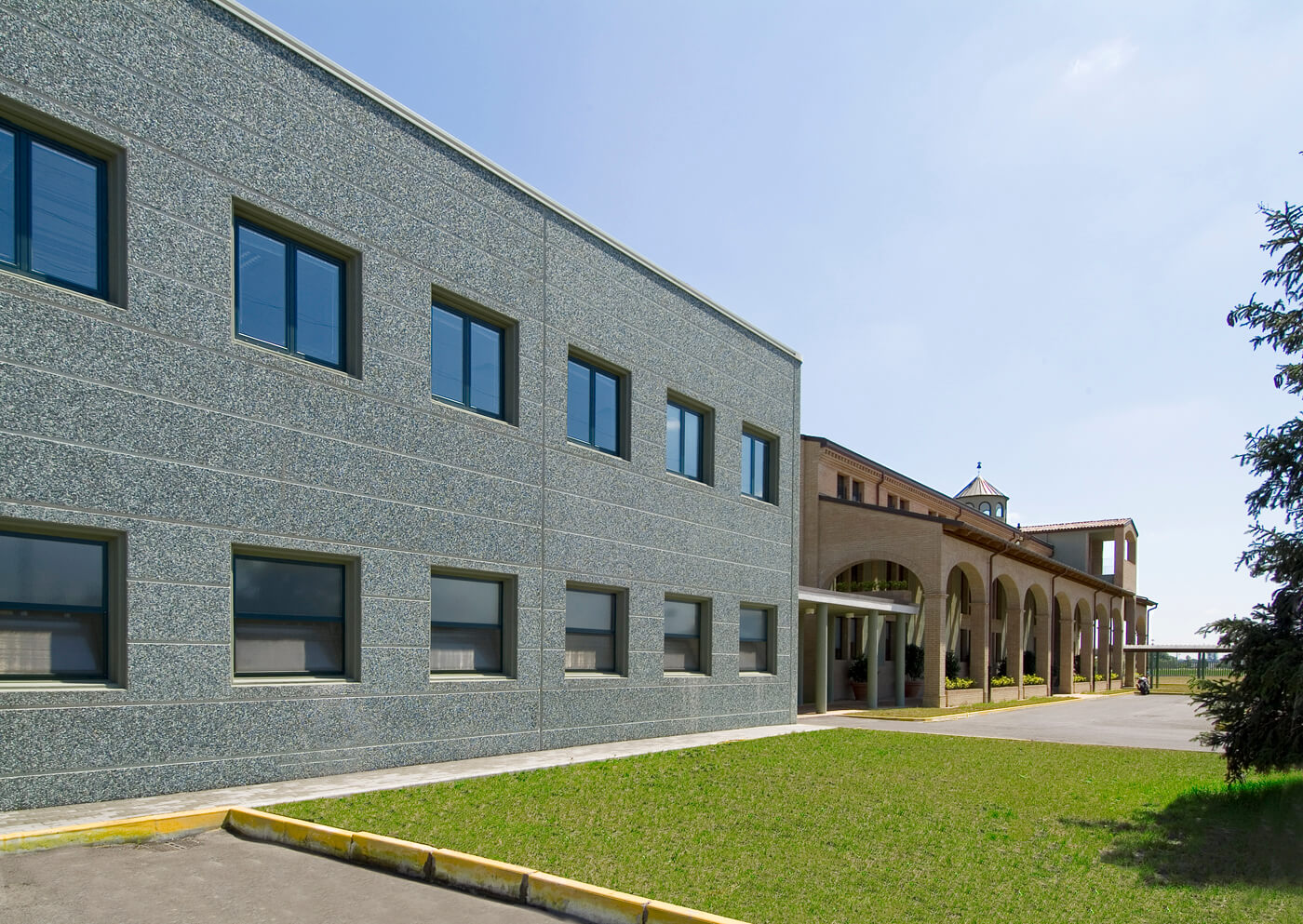 Per gli esterni, è stata richiesta una finitura dei pannelli in graniglia di marmo ‘verde alpi’ che richiama le tonalità cromatiche della vegetazione, raccordando idealmente il paesaggio artificiale con quello naturale della campagna circostante. L’impiego di un reticolo di false fughe prospettiche ha poi consentito di ridurre l’impatto visivo dell’imponente costruzione (alta oltre 14 mt sul fronte autostradale) donando leggerezza e movimento a tutte le superfici, incluse quelle senza porte né finestre.